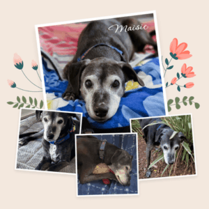 Over the past year, four amazing fosters have stepped up to nurse her through recovery, showering her with love. Meanwhile, Maisie, who has been diagnosed with Canine Cognitive Dysfunction (CCD), continues to thrive and liver her best senior life. Despite all she’s been through, Maisie remains affectionate, resilient, and full of heart. She still enjoys her sun naps, leisurely sniffaris in the garden, and while the zoomies are behind her, she now skips through her short walks with joy.